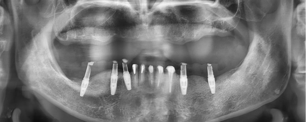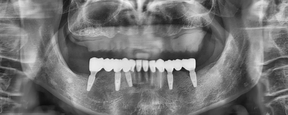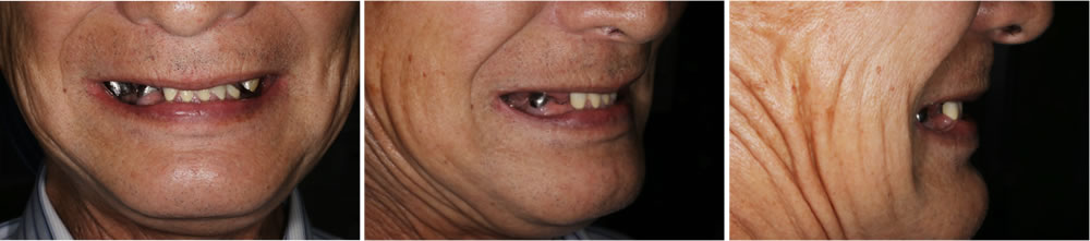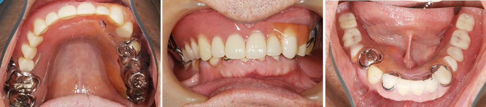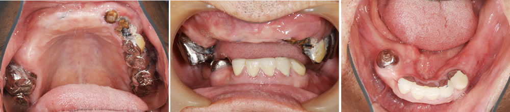 残存している歯は全て不良補綴物の状態で、虫歯も進行していました。多数の欠損が認められ、すれ違い咬合という、上下の歯が噛み合う場所がなく、噛み合わせが非常に不安定な状態でした。