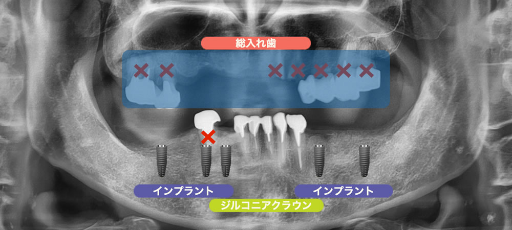 ・下顎:右下4抜歯 → 前歯セラミッククラウン、奥歯インプラント