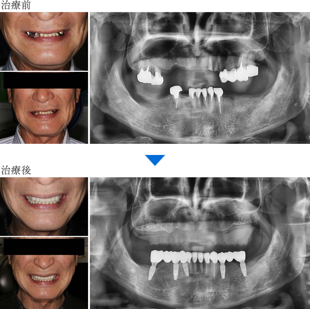 現在では、何でもしっかり噛めるようになり、口元を気にせず笑えるなど、口腔内のストレスなく生活できているとのことです。時間や費用はかかったものの、「思い切って治療を受けて本当に良かった」とのお言葉をいただきました。